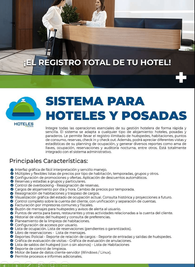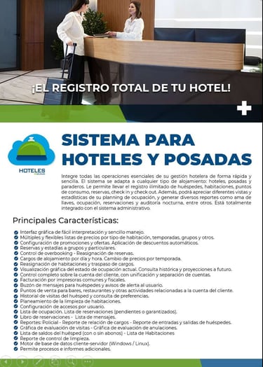 Integre todas las operaciones esenciales de su gestión hotelera de forma rápida y sencilla. El sistema se adapta a cualquier tipo de alojamiento: hoteles, posadas y paraderos. Le permite llevar el registro ilimitado de huéspedes, habitaciones, puntos de consumo, reservas, check in y check out. Además, podrá apreciar diferentes vistas y estadísticas de su planning de ocupación, y generar diversos reportes como ama de llaves, ocupación, reservaciones y auditoría nocturna, entre otros. Está totalmente integrado con el sistema administrativo.